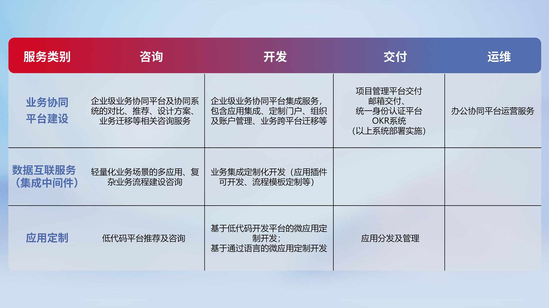 针对钉钉、、、企微、、、IDaas等平台级产品提供产品的规划、、方案、、、交付、、定制化开发等服务,,,,实现如统一协同办公、、、、智能客户服务、、、、混合会议管理、、、、智能数据查询、、、、等业务场景,,实现数字化转型。。
