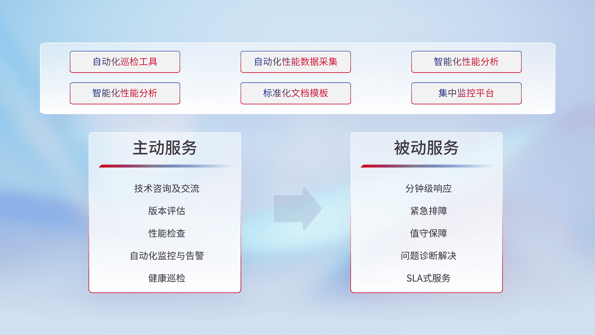 智能化工具和标准化文档,,,,保障服务质量,,,提供主动服务(包含技术咨询、、、版本评估、、性能检查、、、、自动化监控与告警、、、、健康巡检)和被动服务包含(分钟级响应、、、紧急排障、、、值守保障、、问题诊断解决、、、、SLA服务)。。